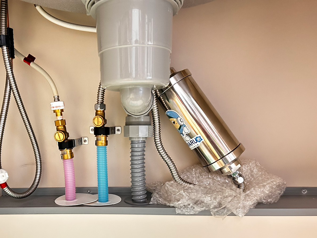 設置は非常にシンプルで、シンク下の配管に繋ぐだけ。狭いキッチンでも、賃貸マンションでも、シンクの下にそっと忍ばせるだけで、今日からお料理の味が劇的に変わります。